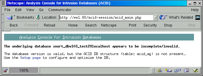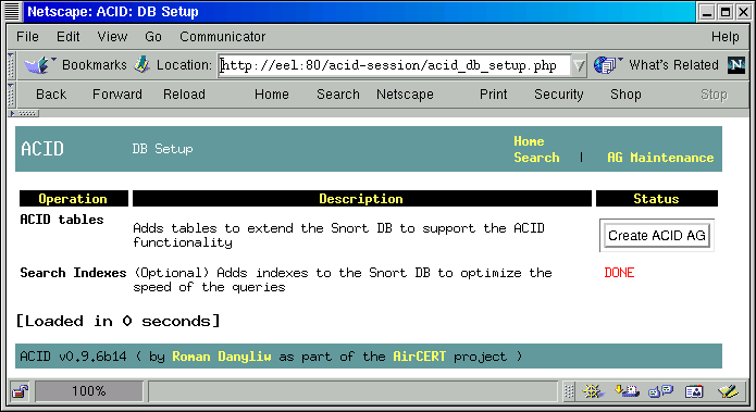 Click on the "Setup page" link to be brought to the DB configuration page (acid_db_setup.php). This next page will facilitate the creation of the necessary tables. Click on the "Create ACID AG" buttons as seen below.