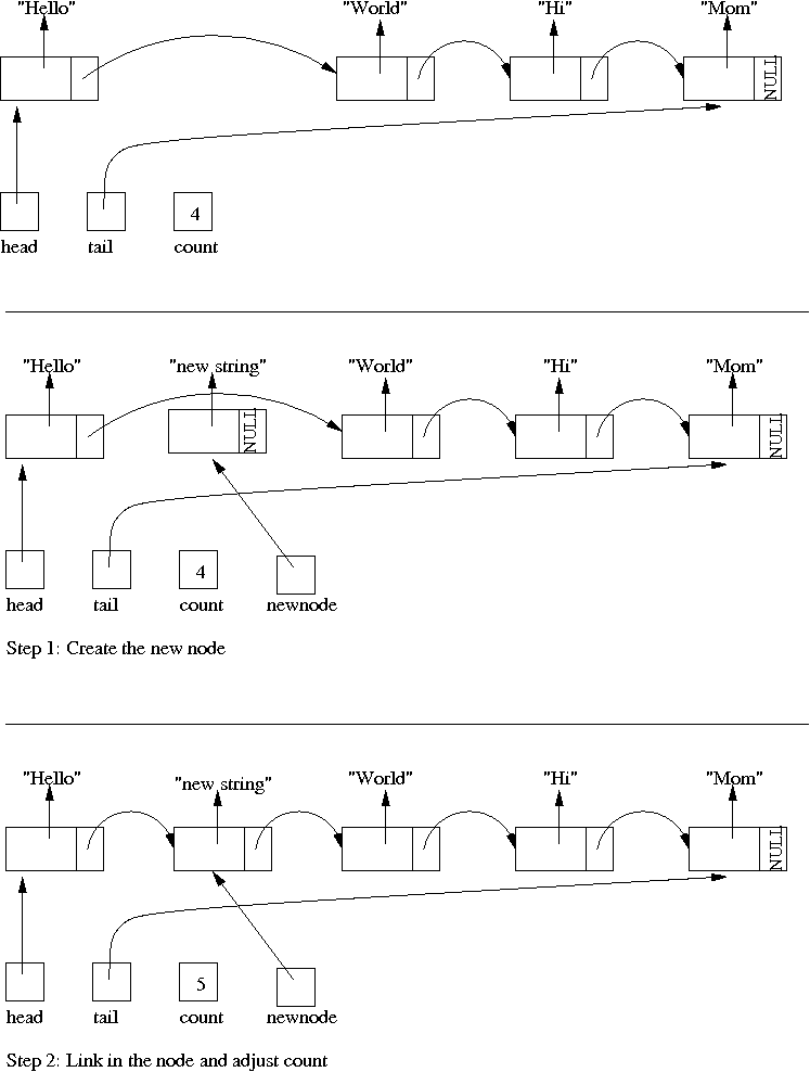 If we neglect the special case of an empty list, adding a node to the end of the list is straight-forward. We create a new node and initialize it so that it's "item" pointer identifies the data item and so that its "next" pointer identifies its intended successor: Nothing (NULL), since it is the last one. Then we set the existing tail's "next" reference to identify this new node as its successor. Then, we update the node's understanding of the tail and of the count of items within the list.