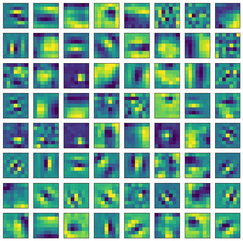 Looking at the weights in the encoder, we can see the filters used in the model for extracting features from the input. While a lot of the filters are not trivial to the human eye, a lot of the filters can be interpreted as gradient filters in the horizontal, vertical and diagonal directions, showing that initially, basic information is extracted from the input.