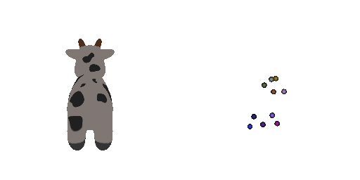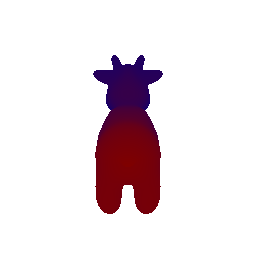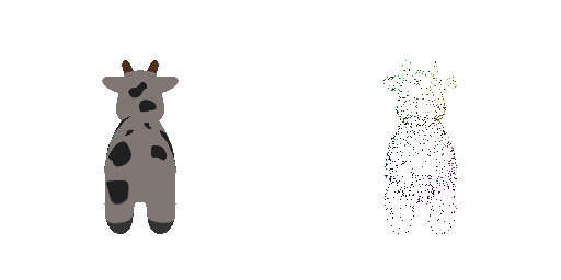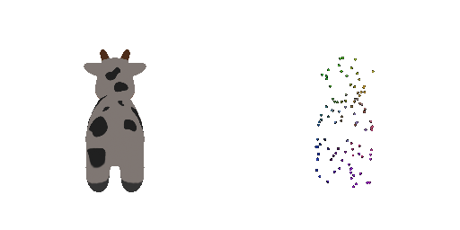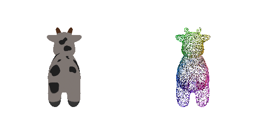 I re-textured the cow via per-vertex colors. Let V be the packed vertices; I normalized a coordinate (e.g., z) and mapped it to a color gradient. Colors were attached with TexturesVertex(verts_features), so Phong shading combines the procedural color with lighting.