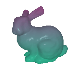 I used the classic Stanford Bunny (OBJ without MTL) and added a playful effect: a subtle “breathing” displacement along vertex normals plus animated procedural colors.