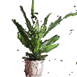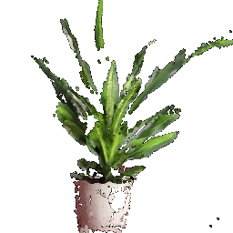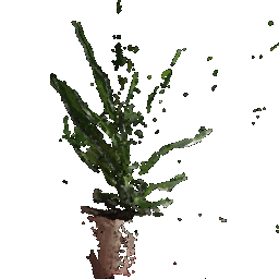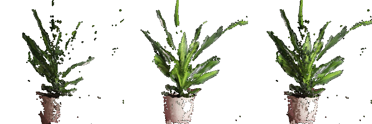 Given two RGB-D frames of a plant, I unprojected each depth map to a point cloud using camera intrinsics/extrinsics: for each pixel I formed [x_ndc, y_ndc, depth] and called camera.unproject_points(..., world_coordinates=True). I then collected the corresponding RGB and constructed Pointclouds.