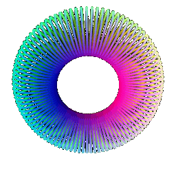 Torus. For angles u,v ∈ [0,2π) with major radius R and minor radius r: x=(R+r cos v)cos u, y=(R+r cos v)sin u, z=r sin v. I sampled a dense grid and rendered as points; using a small point radius preserves the hole.