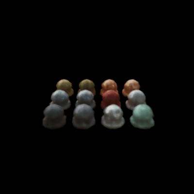 View independent model has a simple diffuse shading, while view dependent emission allows the model to more accurately express effects such as specular highlights. However, this also makes the model more complex and potentially harder to generalize - it must learn not only the underlying geometry and diffuse appearance, but also how appearance changes with viewing direction. As a result, view-dependent emission can capture realistic lighting effects like reflections and gloss, while a purely diffuse (view-independent) model tends to produce more matte, consistent surfaces that may miss such details.