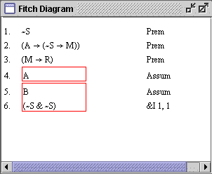 Formulae in the Fitch diagram correspond exactly to the formula in pencil-and-paper derivations. The formulae are the primary objects in the Fitch with which you will interact in the course of completing a derivation.