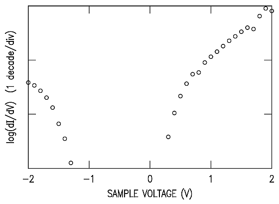 This example illustrates the current vs. voltage for the situation discussed in example 1 of Mult2, with n-type GaAs that has a 10 nm diameter region centered around the tip location having a high density of extrinsic states (with charge neutrality level at midgap). Several tenths of an eV of band bending occurs in the vicinity of this area. The contact potential is set to 0 eV. The conductance vs. voltage from FORT.15 appears as: